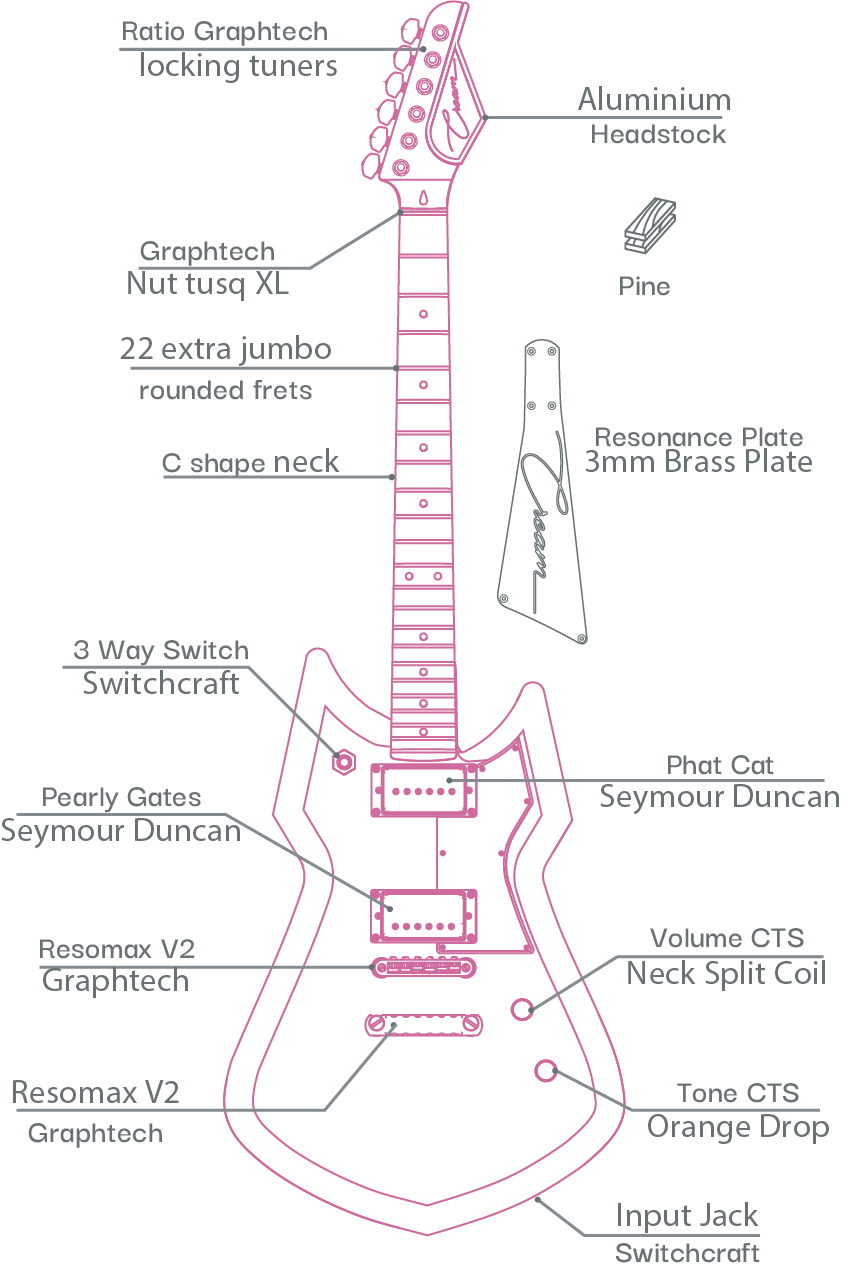 Volume CTS 500k pots Tone CTS 500k pots Seymour Duncan Phat Cat Seymour Duncan Pearly Gates Input Jack Switchcraft 3-way switch Switchcraf Resomax V2 Graphtech