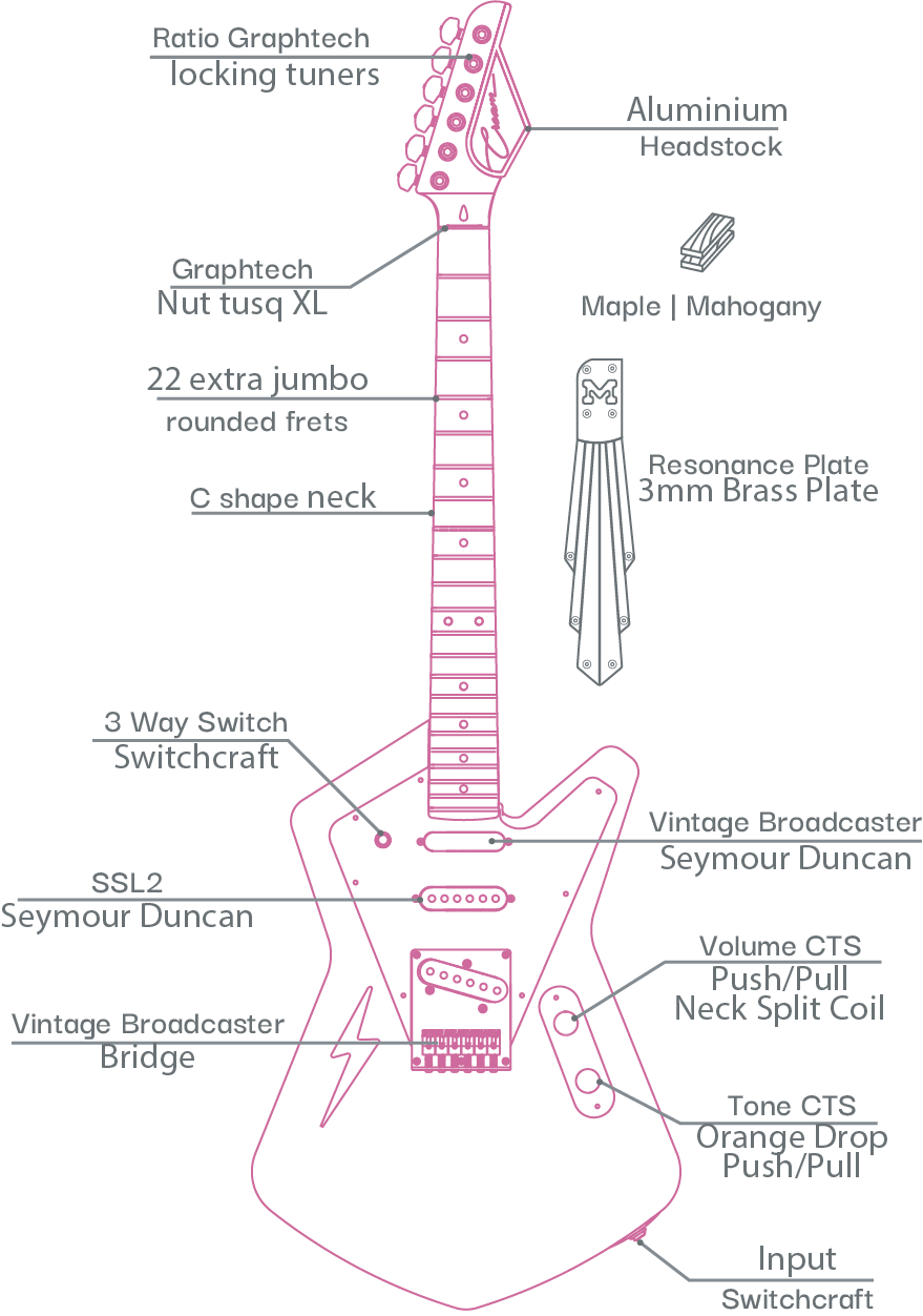 Chrome, gold or black Hardware Ratio Graphtech locking tuners Graphtech nut tusq XL Jumbo frets T-Style bridge GHS #10 strings White, Black or Vintage Pearl Pickguard Stainless steel screws