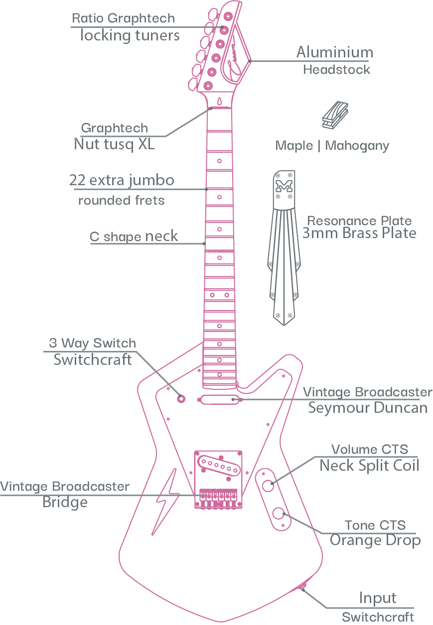 Chrome, gold or black Hardware Ratio Graphtech locking tuners Graphtech nut tusq XL Jumbo frets T-Style bridge GHS #10 strings White, Black or Vintage Pearl Pickguard Stainless steel screws